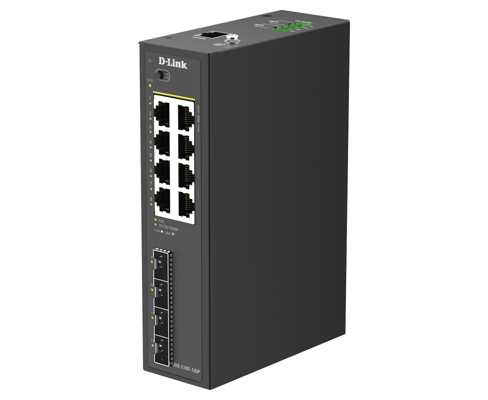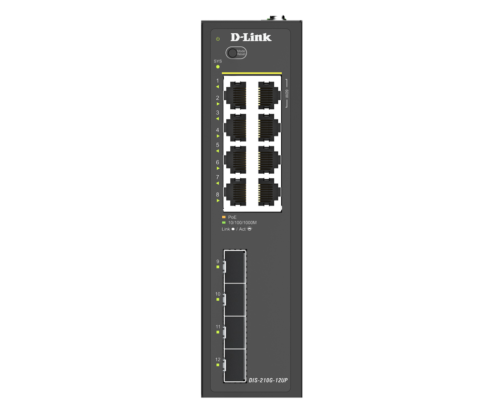 Промышленный управляемый L2 коммутатор DIS-210G-12UP, оснащенный 8 портами 10/100/1000Base-T с поддержкой PoE, а также 4 портами 1000Base-X SFP, которые используются для организации подключения к высокоскоростной магистрали, предназначен для применения в сетях промышленных предприятий. DIS-210G-12UP поддерживает расширенные функции управления и безопасности. Функции управления включают SNMP, управление на основе Web-интерфейса и интерфейс командной строки (CLI).