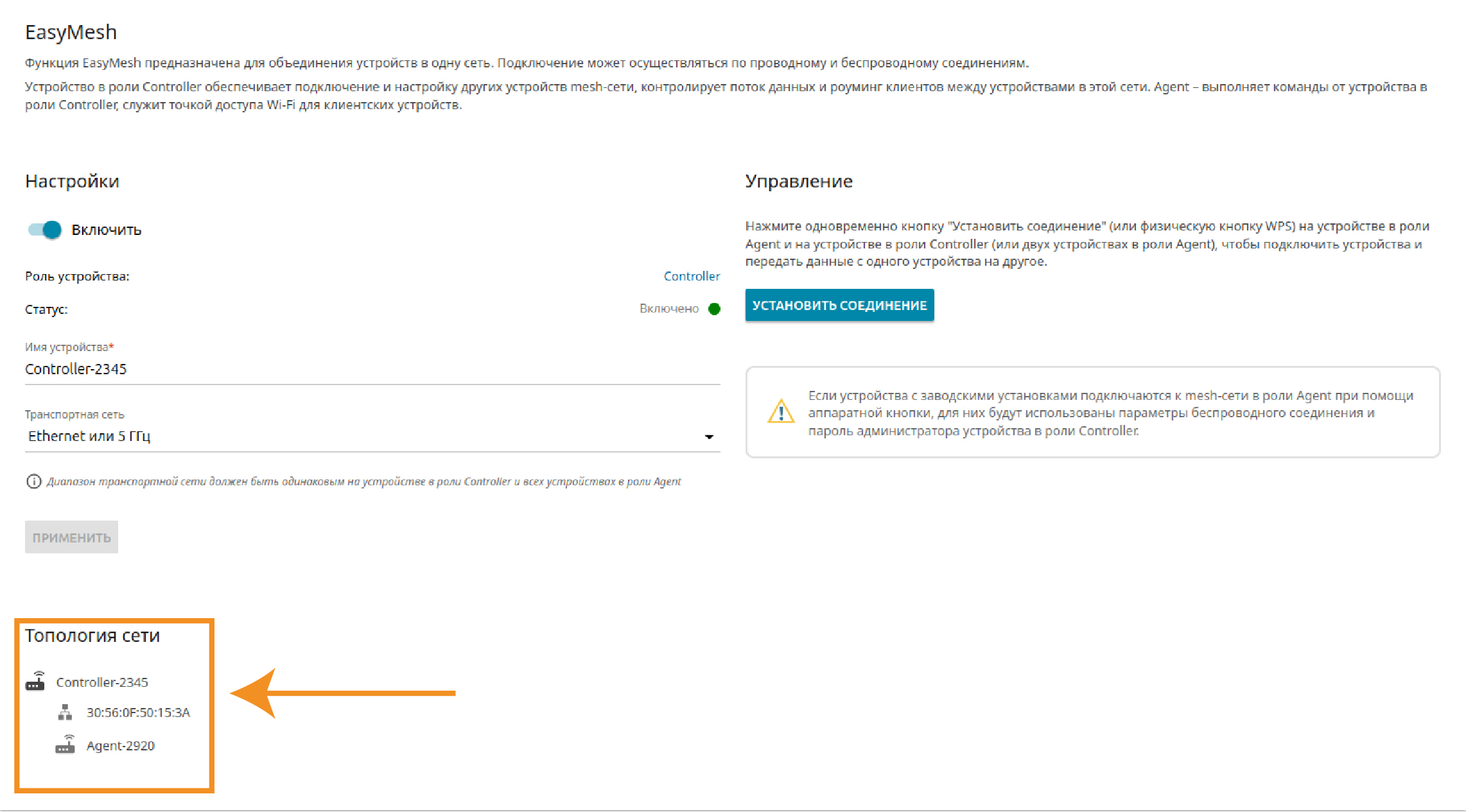 Перейдите на страницу EasyMesh агента и нажмите кнопку Установить соединение.