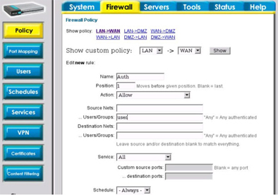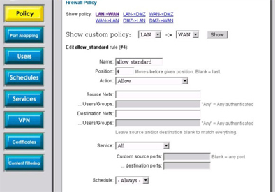 Правила в этих устройствах просматриваются сверху вниз. Правилом отбираются пакеты, полностью удовлетворяющие всем его условиям, как то адрес источника(source nets), адрес приемника(destination nets), тип сервиса (service), аутентификация источника и приемника (users/groups), правило времени (schedule). То есть пакет, удовлетворяющий определенному правилу, должен совпадать по всем параметрам.