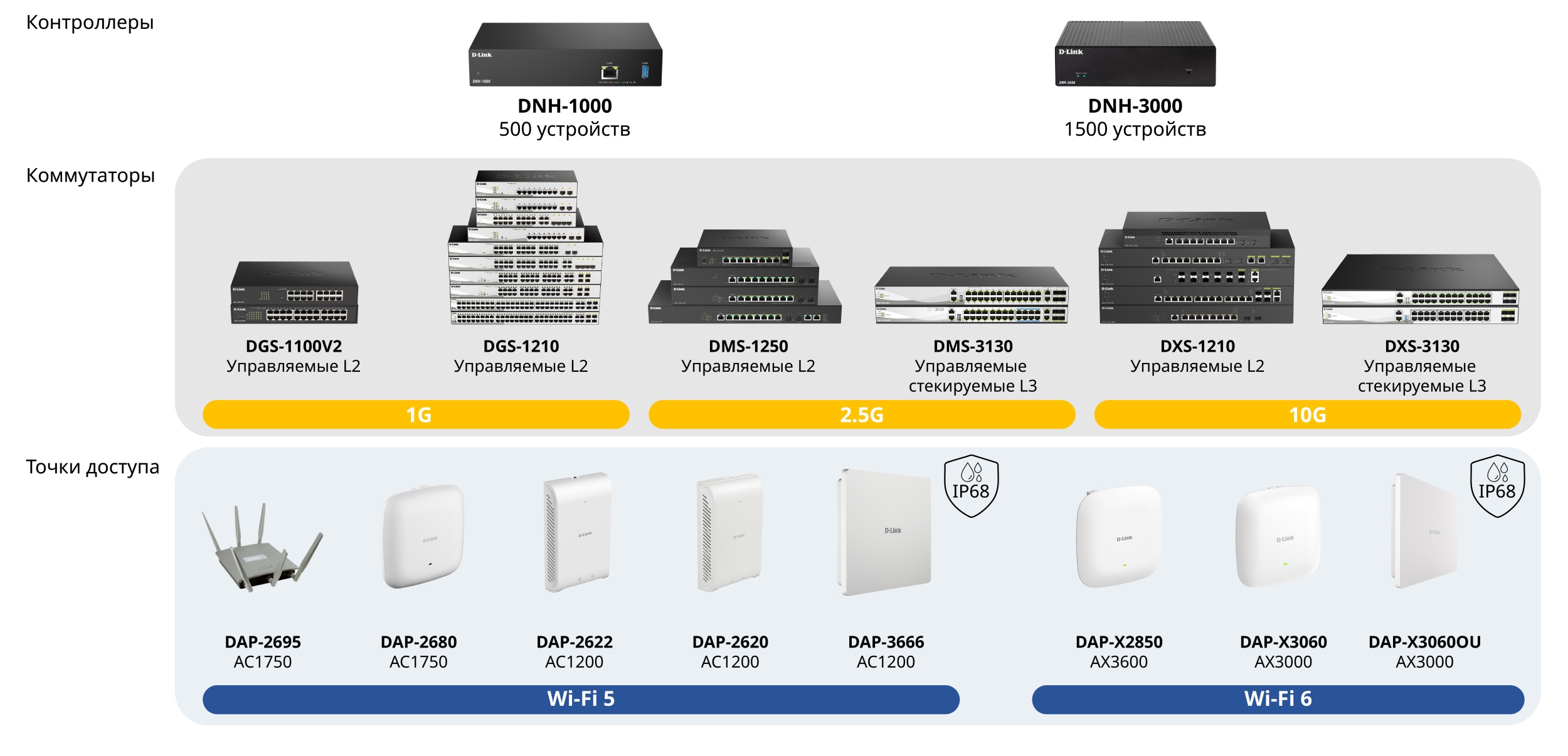 - внутренние и внешние точки доступа серии DAP c поддержкой стандартов Wi-Fi 6/5,