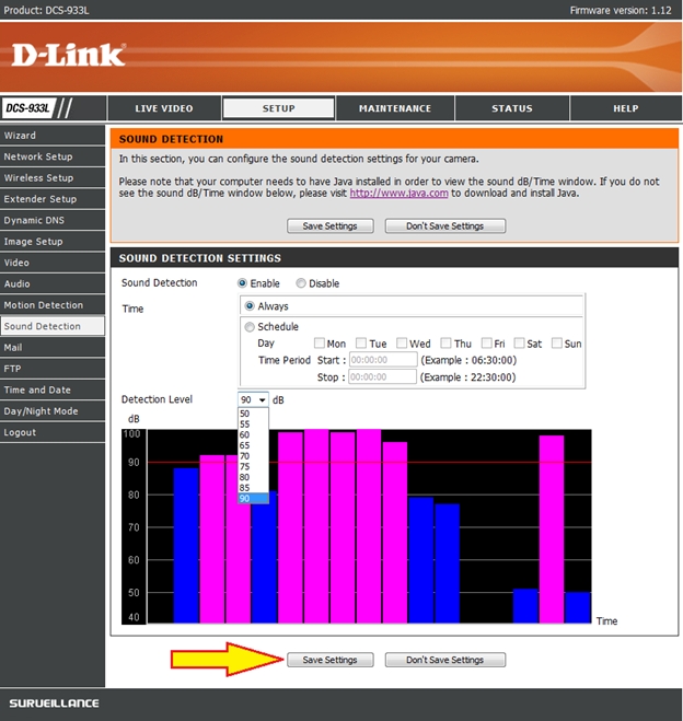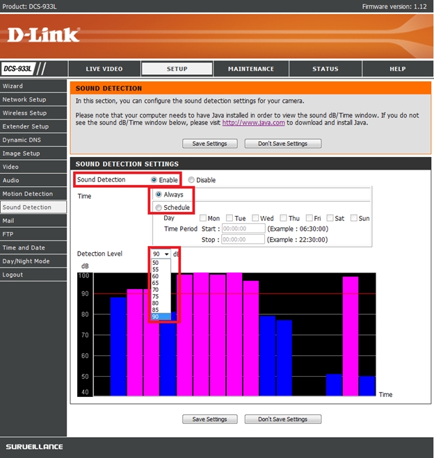 В поле Detection Level (Уровень обнаружения) установите пороговое значение для срабатывания датчика, где 90 dB - максимальная чувствительность, 50 dB - минимальная.