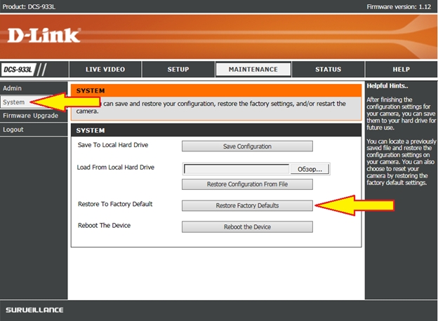 Шаг 6: После обновления прошивки камеру рекомендуется сбросить к заводским настройкам. Для этого в меню слева выберите  System (Система) и нажмите кнопку Restore Factory Defaults (Восстановить заводские настройки).