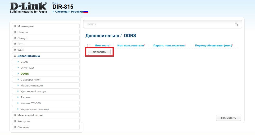 3. Введите необходимые данные, включая имя хоста, имя пользователя, пароль и период обновления, т.е. интервал времени, через который будет происходить проверка соответствия IP-адреса на WAN-интерфейсе устройства и сохраненного на сервисе DDNS. Нажмите Применить.
