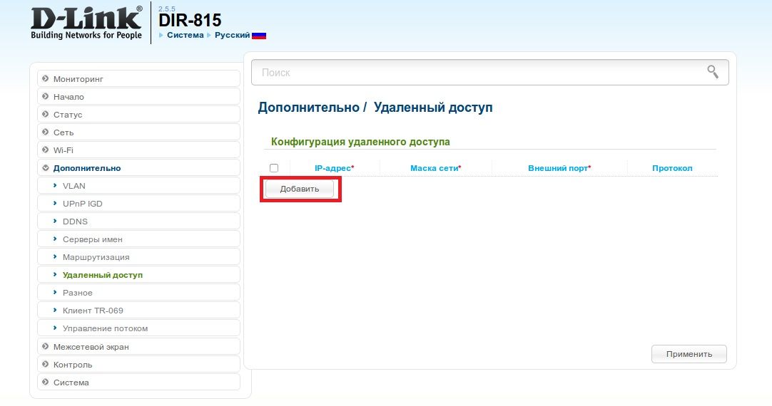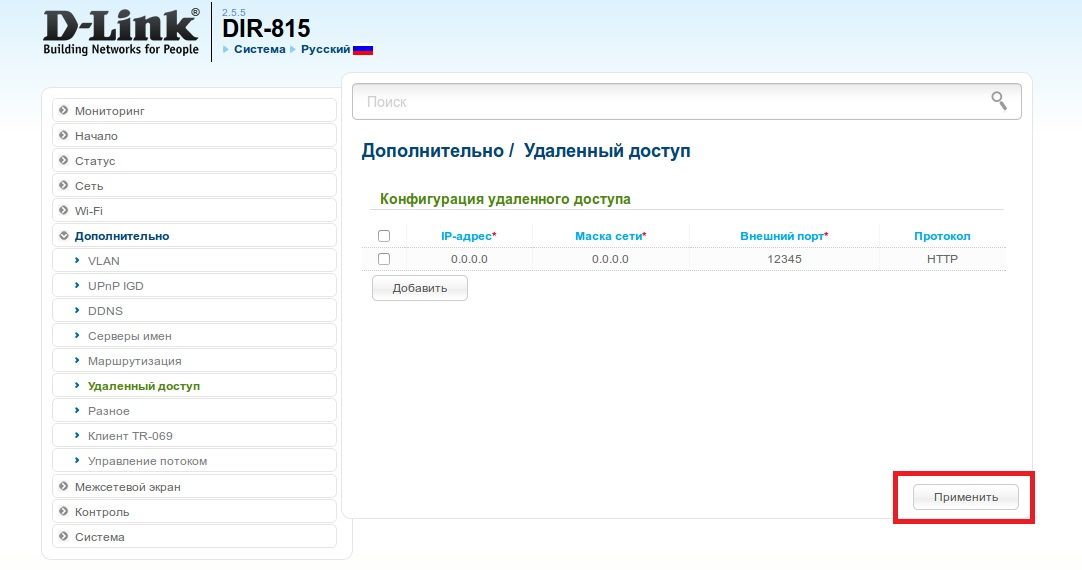 3. Введите IP-адрес удаленного узла и его маску, а также укажите внешний порт, который будет использоваться для доступа. Нажмите Применить для добавления правила в список.