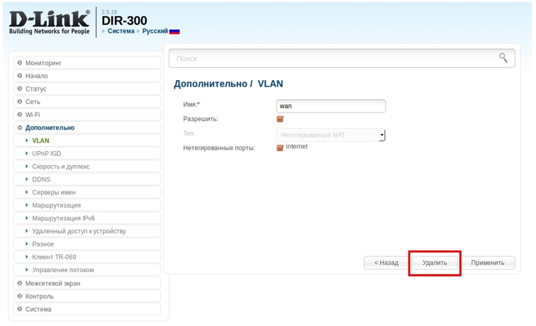 4. На вкладке VLAN  выберите группу портов WAN, в открывшемся окне нажмите кнопку Удалить. Подтвердите действие.