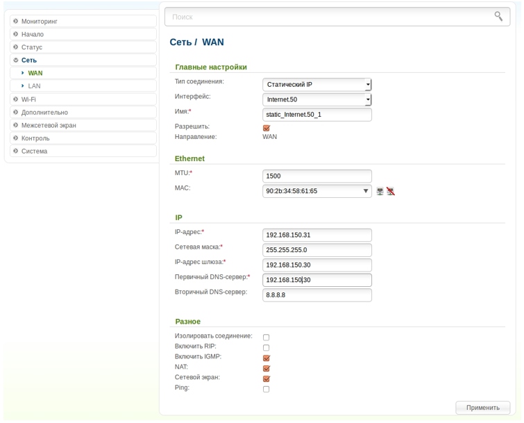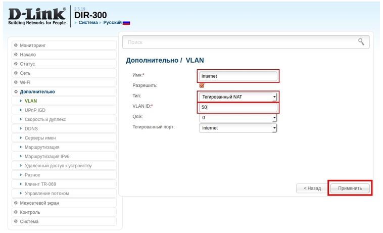 Интерфейс – Internet.VLAN ID (где VLAN ID – это необходимый идентификатор виртуальной сети);