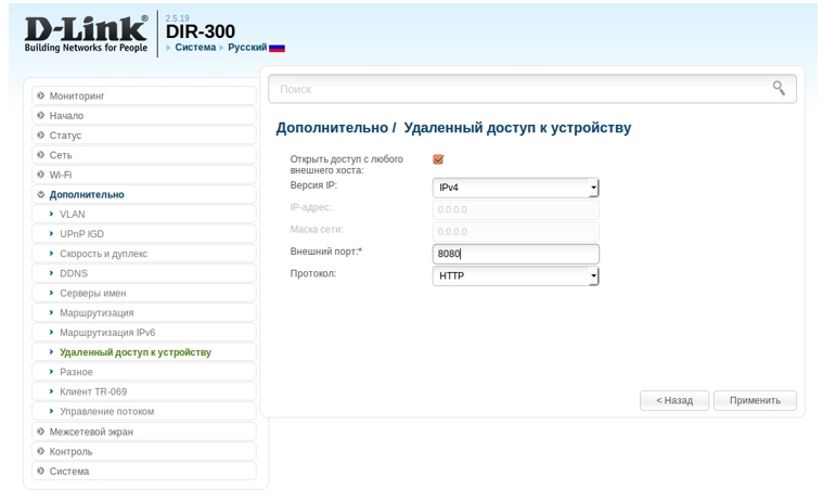 Для дальнейшей конфигурации устройства необходимо обратиться к Web-интерфейсу маршрутизатора из внешней сети. Для этого в адресной строке браузера введите IP-адрес, указанный в настройках соединения, и номер порта, заданный в настройках удаленного доступа, в следующем формате :. Доступ к Web-интерфейсу также можно получить с любого устройства, подключенного к беспроводной сети маршрутизатора (локальная сеть маршрутизатора).