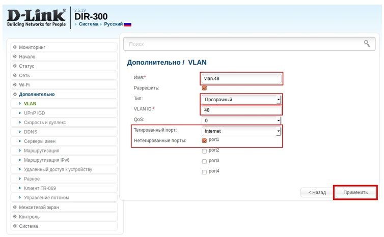VLAN ID – укажите необходимый ID (в данном примере 48);