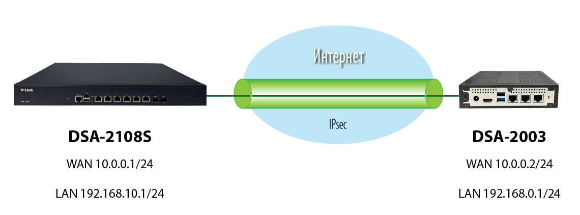 В данном примере приведена настройка IPsec-туннеля для организации безопасного VPN-подключения между DSA-2108S и DSA-2003. WAN- и LAN-интерфейсы маршрутизаторов настроены в соответствии со значениями, приведенными на рисунке. Тип соединения для DSA-2108S – Статический IPv4 с именем statip_50; для DSA-2003 – Статический IPv4 с именем statip_25.