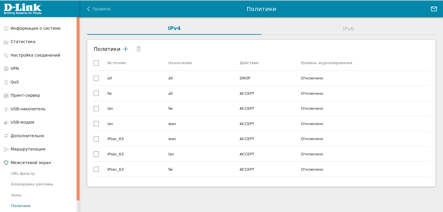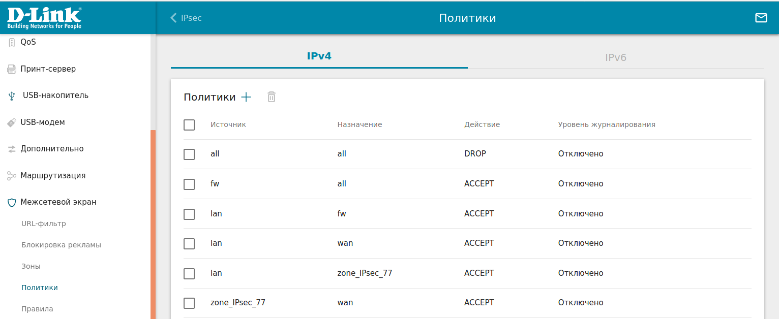 1.6.5. Затем необходимо для IPsec-туннеля создать политики для обозначения направления прохождения трафика. Для этого в левом меню перейдите к разделу Межсетевой экран и далее – на страницу Политики.