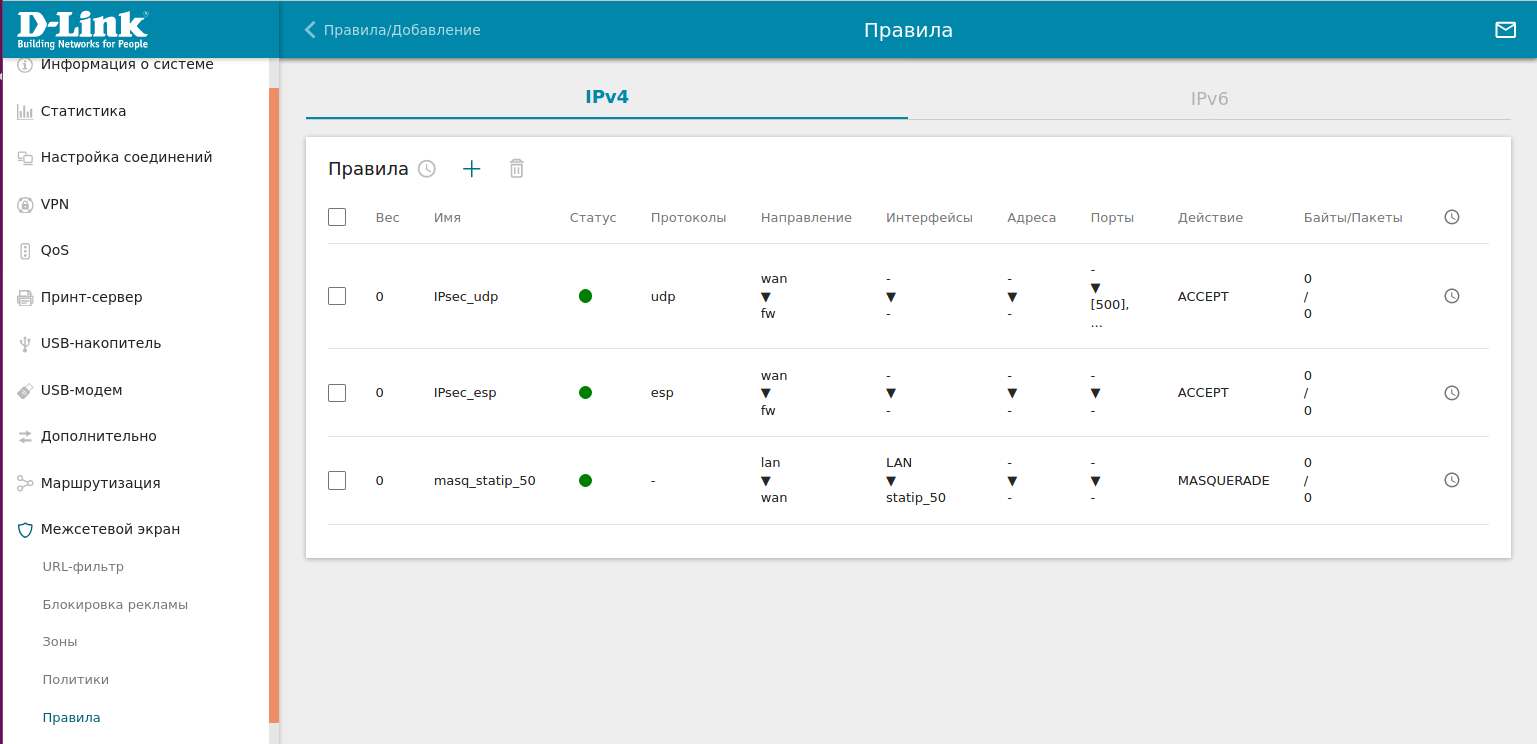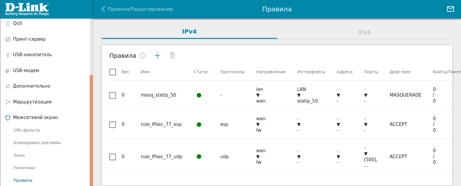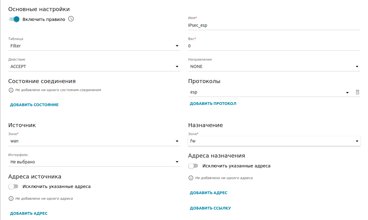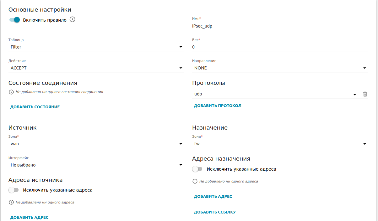 Во вкладке IPv4 добавьте 2 новых правила по протоколам UDP и ESP, нажав на «+».