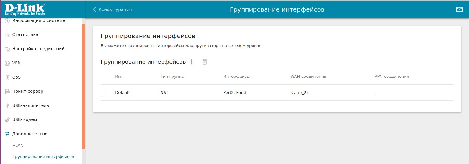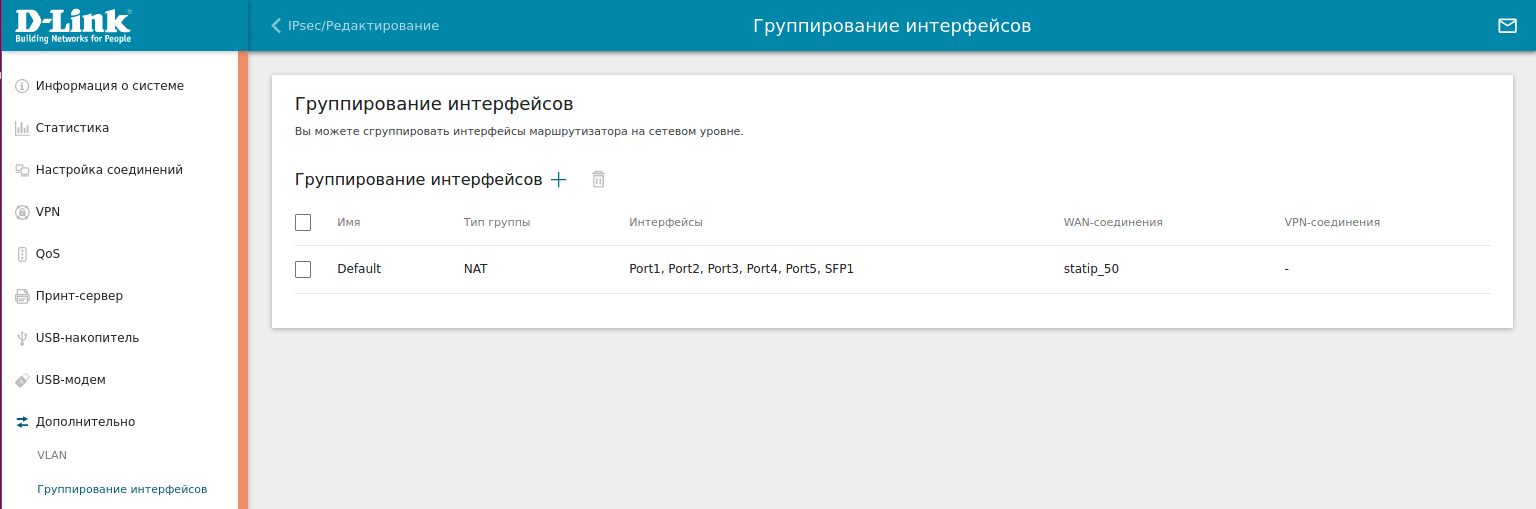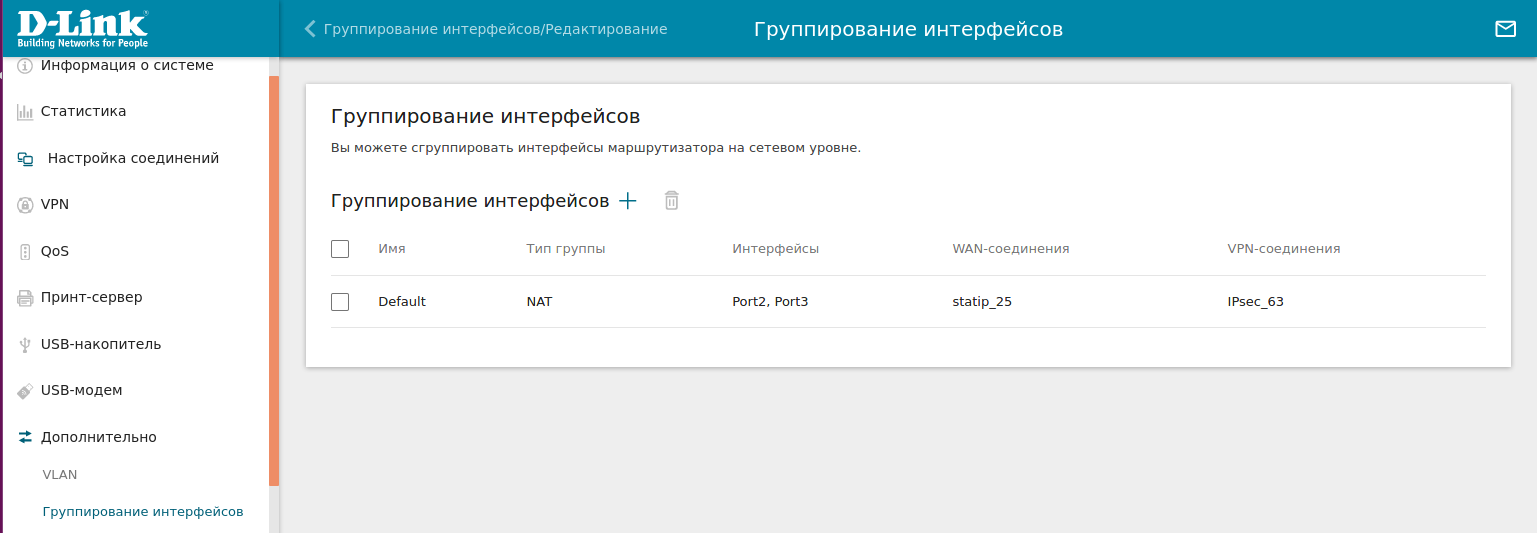 В левом меню перейдите к разделу Дополнительно, откройте страницу Группирование интерфейсов.