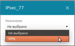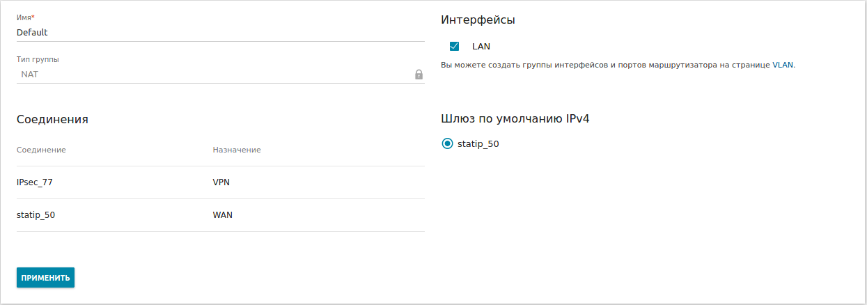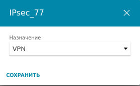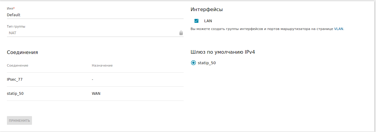 На странице Группирование интерфейсов перейдите в группу с именем Default, в графе Соединения выберите IPsec-туннель IPsec_77 и укажите его в качестве VPN. Нажмите Сохранить.