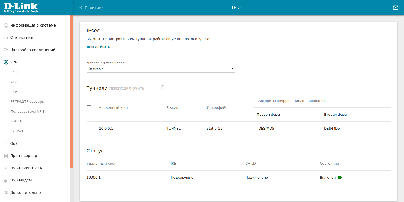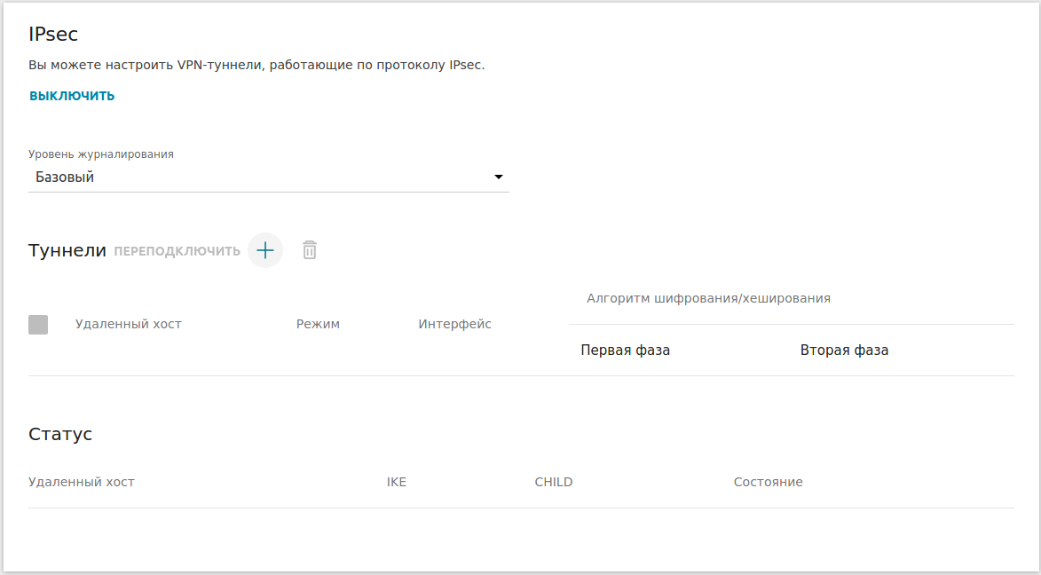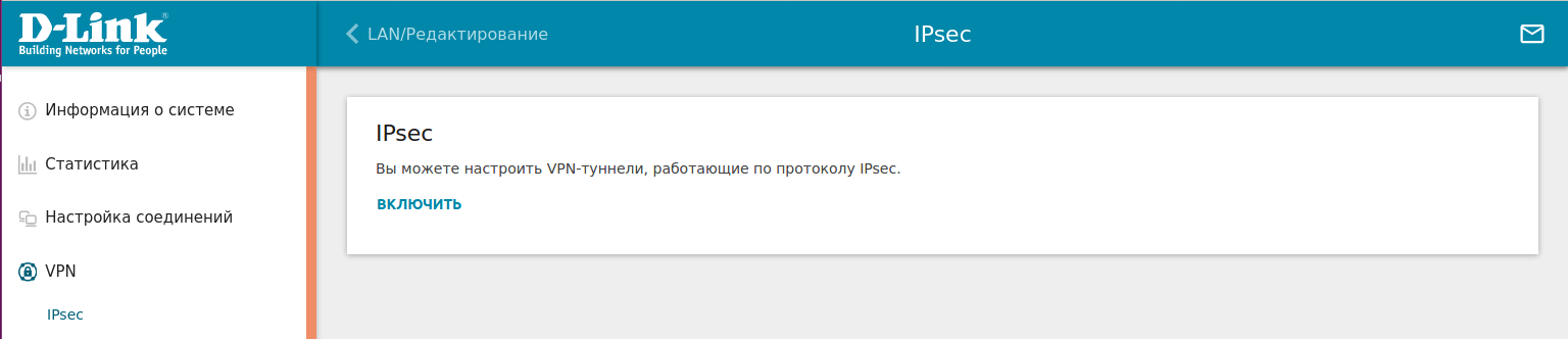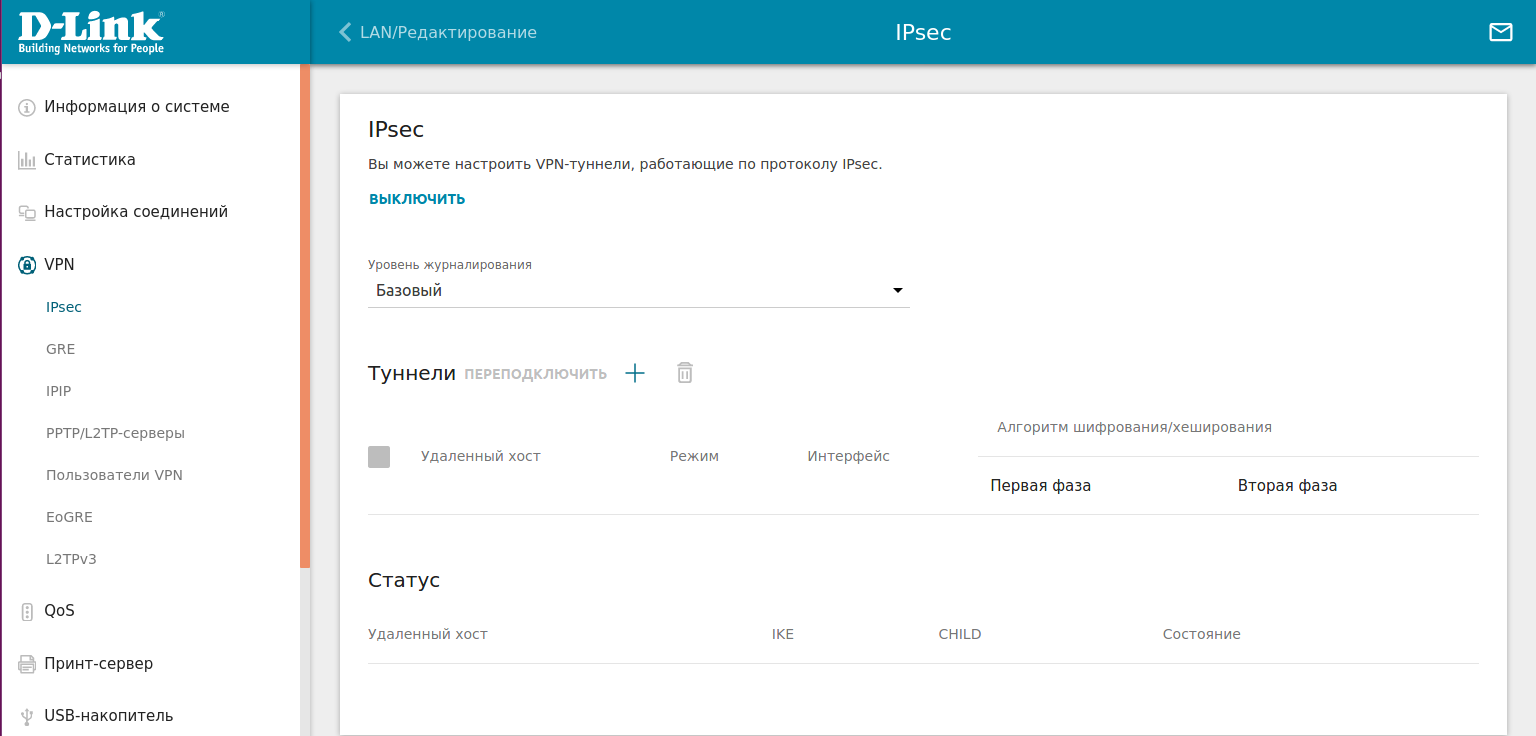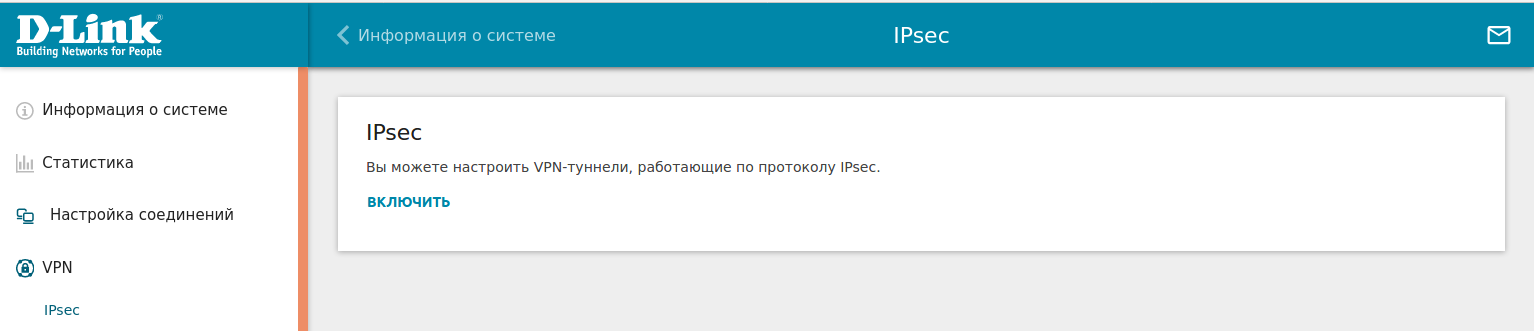 2.1. В основном меню слева перейдите к разделу VPN, далее – на страницу IPsec. Для включения VPN-сервиса IPsec нажмите Включить.