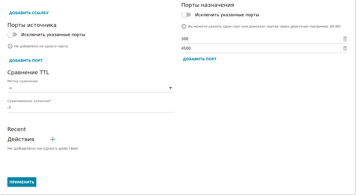Заполните в правилах поля, как показано ниже, и нажмите кнопку Применить.