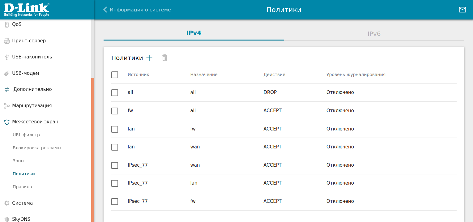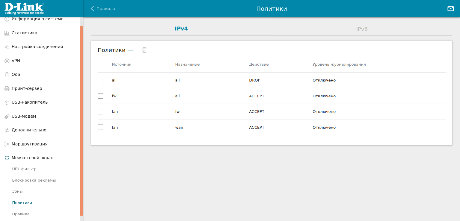 Для проверки настроенных политик перейдите в левом меню в раздел Межсетевой экран, далее – в Политики.