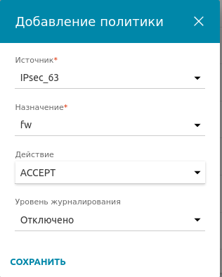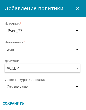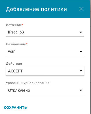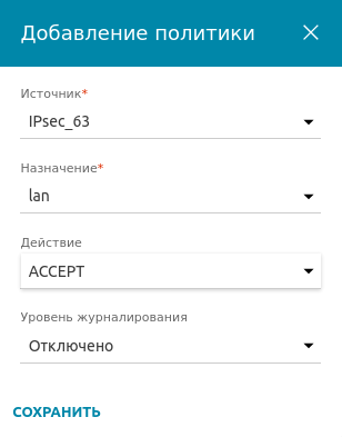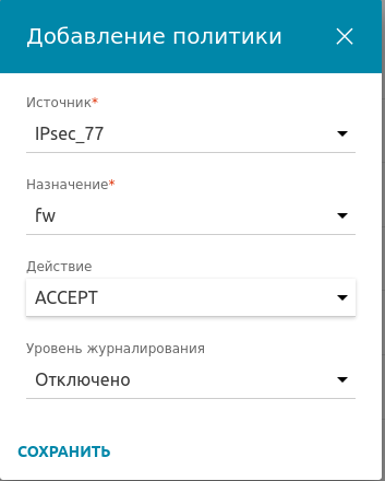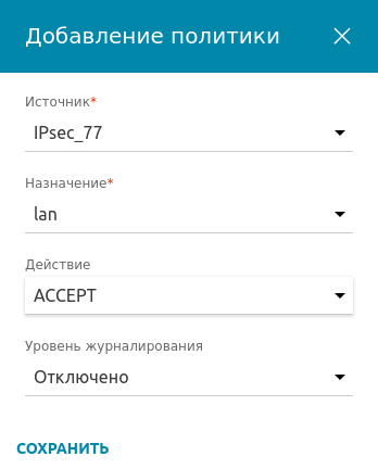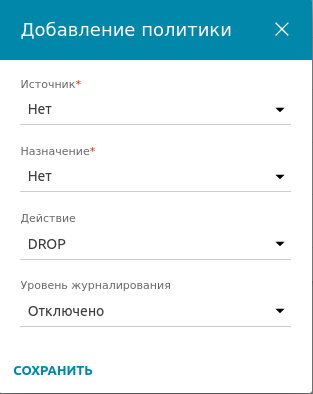 В открывшемся окне укажите вариант прохождения трафика, выбрав необходимые зоны и действие (ACCEPT, DROP или REJECT), затем нажмите СОХРАНИТЬ.