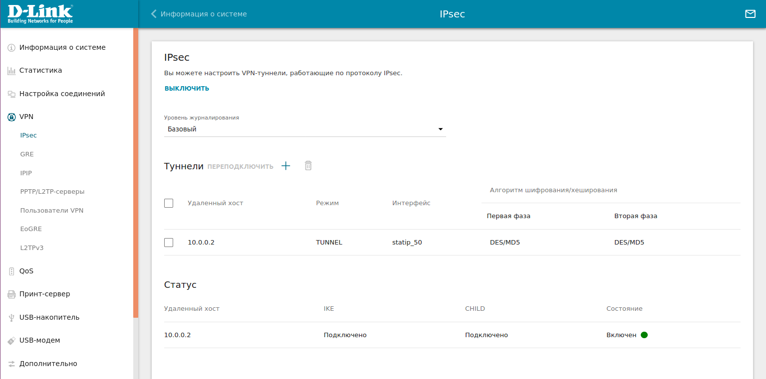 2.7. Для проверки настроенного IPsec-туннеля перейдите в левом меню в раздел VPN, далее – в IPsec.
