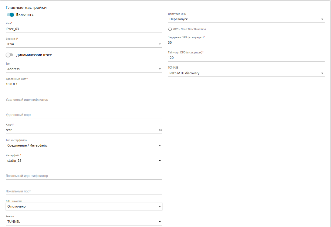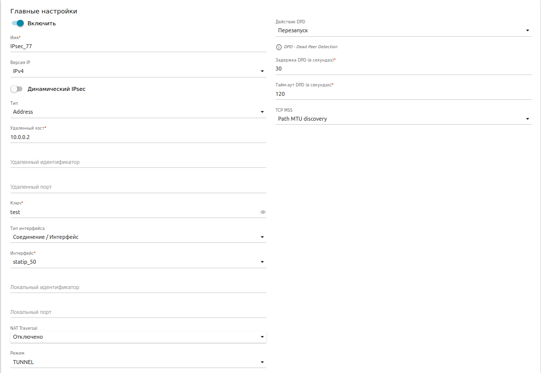 Выберите Тип интерфейса: Соединение/Интерфейс и в графе Интерфейс укажите конкретное соединение, для которого организуется IPsec-туннель (в данном примере это statip_50).