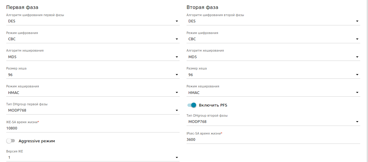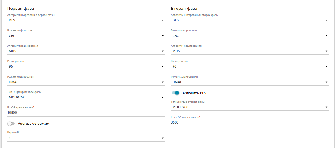 2.3. Все остальные настройки, включая настройки времени жизни и шифрование для 1 и 2 фазы, оставьте по умолчанию. Настройки 1 и 2 фазы приведены ниже.