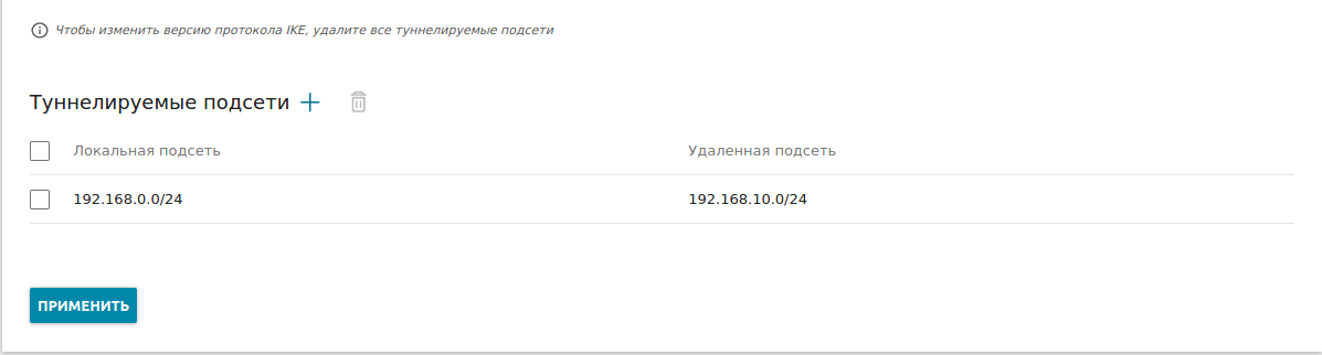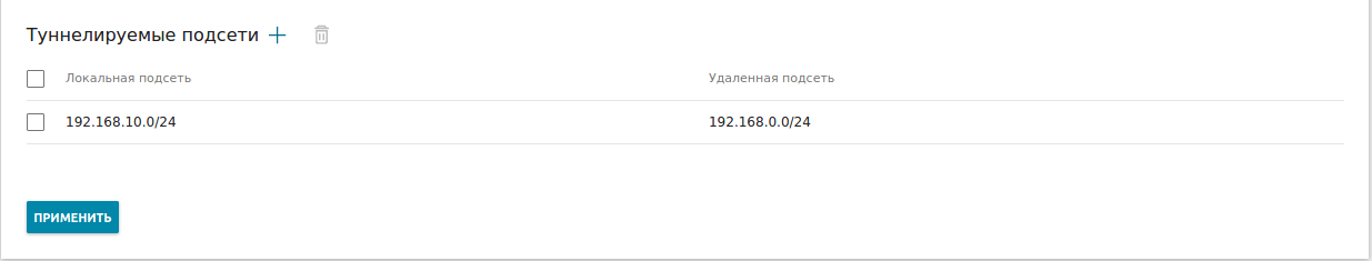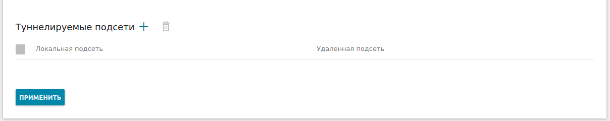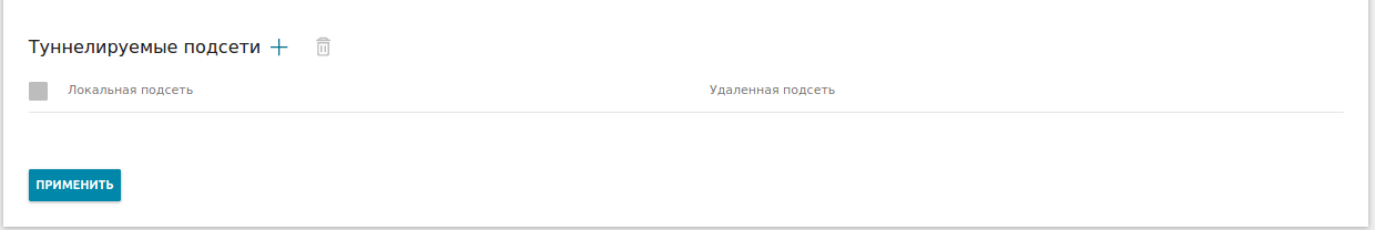 1.4. В разделе Туннелируемые подсети необходимо добавить локальную и удаленную подсеть для настраиваемого туннеля. Нажмите кнопку «+».