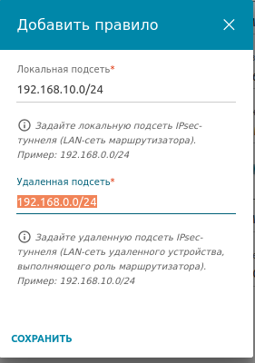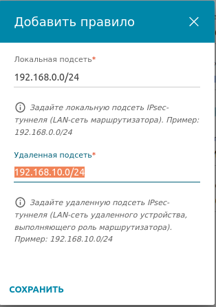 Добавьте адрес локальной подсети (в данном примере это 192.168.0.0/24) и адрес удаленной подсети (в данном примере это 192.168.10.0/24), затем нажмите Сохранить.