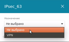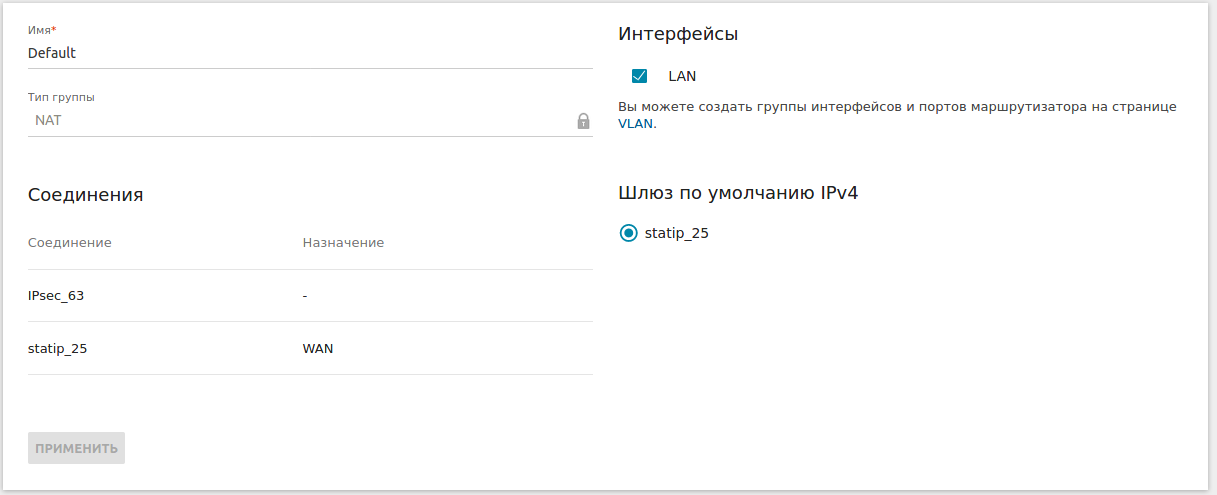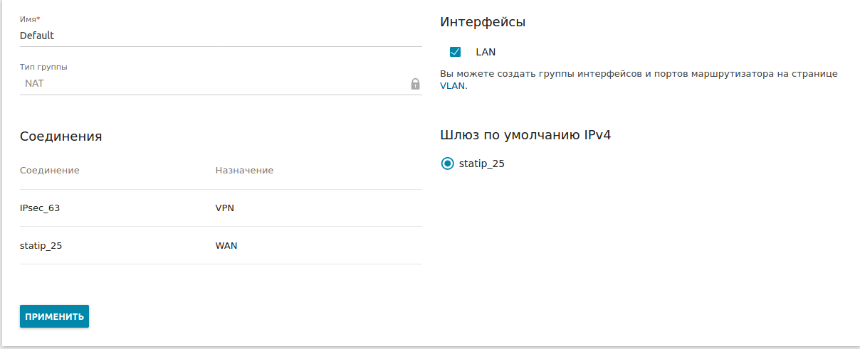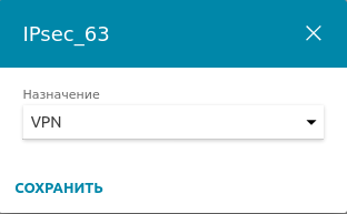 На странице Группирование интерфейсов перейдите в группу с именем Default, в графе Соединения выберите IPsec-туннель IPsec_63 и укажите его в качестве VPN. Нажмите Сохранить.