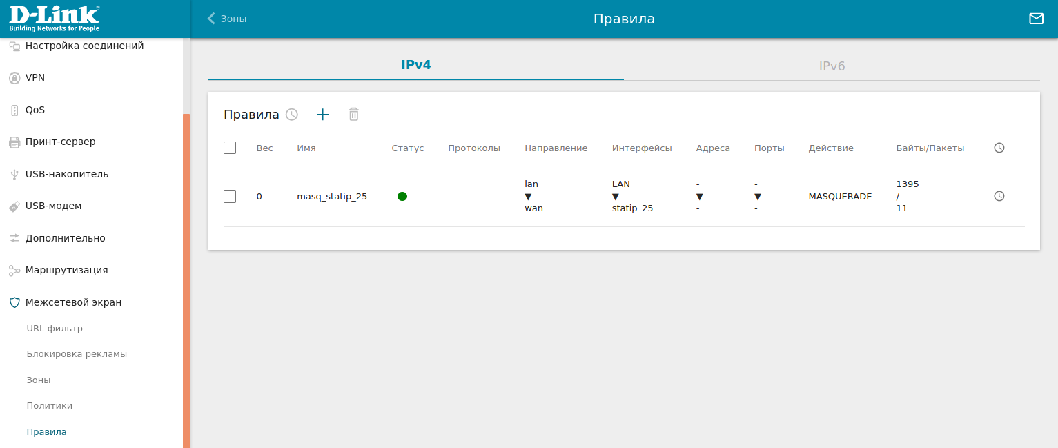 Для проверки настроенных правил перейдите в левом меню в раздел Межсетевой экран, далее – в Правила.