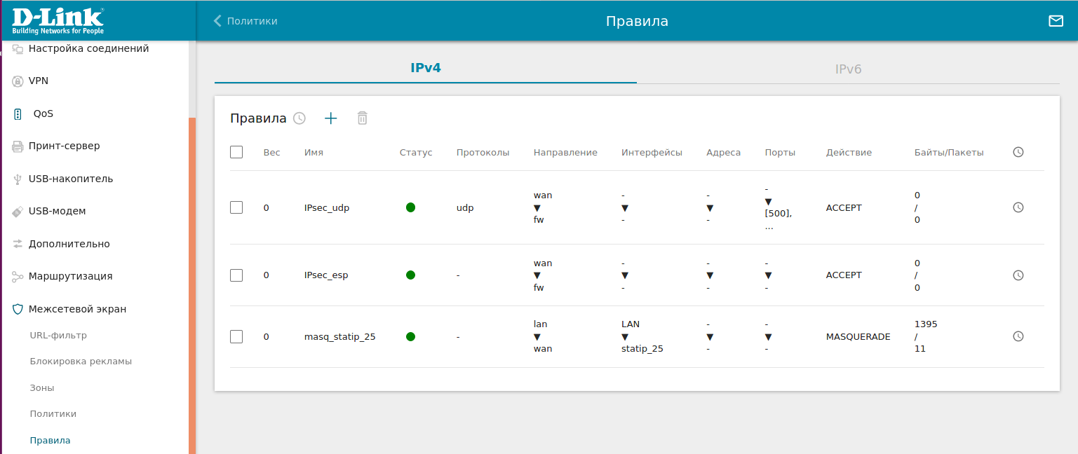 Проверить настроенные правила можно в разделе Межсетевой экран, далее – Правила.