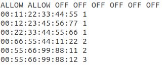 Первая строка: действие ACL для конкретного SSID. Могут быть варианты ALLOW , DENY и OFF