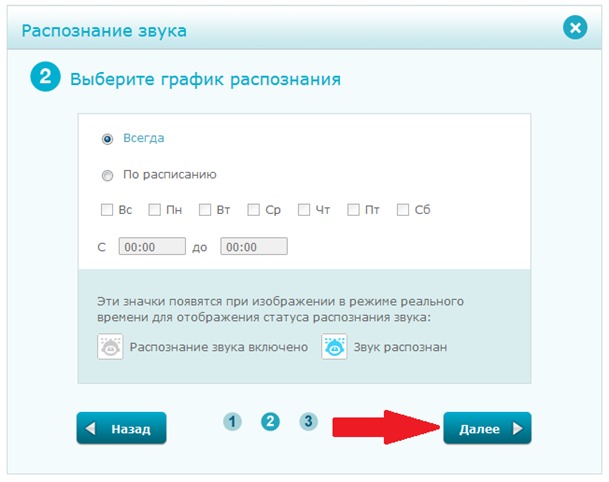 Шаг 6: Установите расписание включения обнаружения звука. Нажмите Далее, чтобы продолжить.
