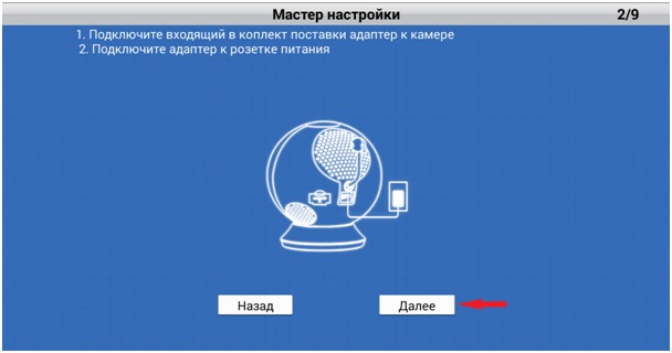 Шаг 6: Если Вы еще не сделали этого, подключите к камере входящий в комплект поставки кабель питания (или USB-аккумулятор). Коснитесь значка Далее.