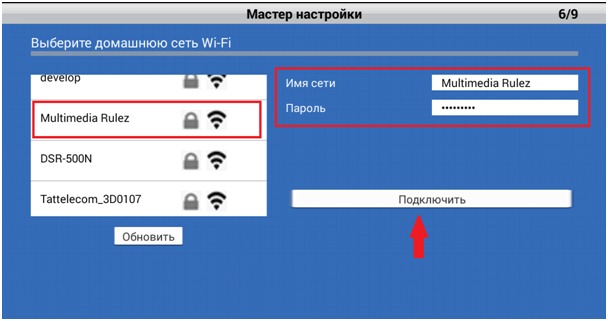 Шаг 10: В представленном списке выберите домашнюю беспроводную сеть, к которой необходимо подключиться, и в соотвествующем поле введите пароль для выбранной беспроводной сети. Имя сети, к которой необходимо подключиться, также можно ввести вручную в поле Имя сети. Далее коснитесь значка Подключить.