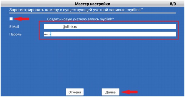 2. Если у Вас нет учетной записи mydlink, установите флажок в поле Создать новую учетную запись mydlink™ и введите адрес электронной почты и пароль для новой учетной записи. Коснитесь Далее.