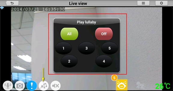 Шаг 3: Коснитесь кнопки колыбельных мелодий (внизу экрана, четвертая слева). Выберите колыбельную мелодию, нажав одну из кнопок 1-5. Можно выбрать воспроизведение всех песен по порядку, нажав кнопку ALL (Все), или остановить воспроизведение, нажав кнопку OFF (Выкл.). Также можно включить или отключить воспроизведение колыбельной с помощью кнопки, расположенной сверху на камере.