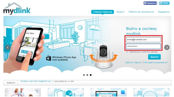 Шаг 2: Введите Ваши учетные данные mydlink (адрес email и пароль) в окне авторизации и нажмите Войти.