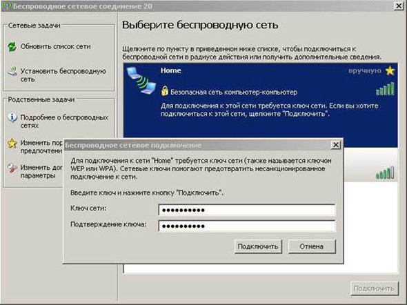 В окне выбора беспроводных сетей нужно выбрать Вашу беспроводную сеть и, в ответ на запрос ключа сети, ввести тот ключ, который Вы задали при настройке шифрации соединения.