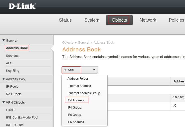 Зайдите на веб интерфейс, Objects → address book, нажмите кнопку add, из выпадающего меню выберите IP Addresses (рис 1.)