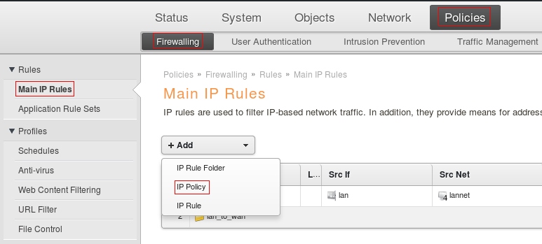 Пройдите в веб интерфейсе Policies → Firewalling → Main IP Rules, нажмите кнопку add, из выпадающего меню выберите IP Policy. (Рис. 7)