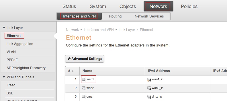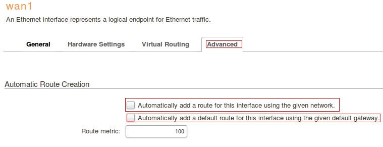 В настройках интерфейса wan1 во вкладке Advanced снимите галочки с Automatically add a route for this interface using the given network и Automatically add a default route for this interface using the given default gateway, а затем нажмите Oк.