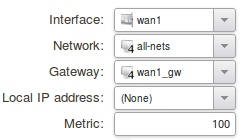 set Interface Ethernet wan1 AutoInterfaceNetworkRoute=No AutoDefaultGatewayRoute=No