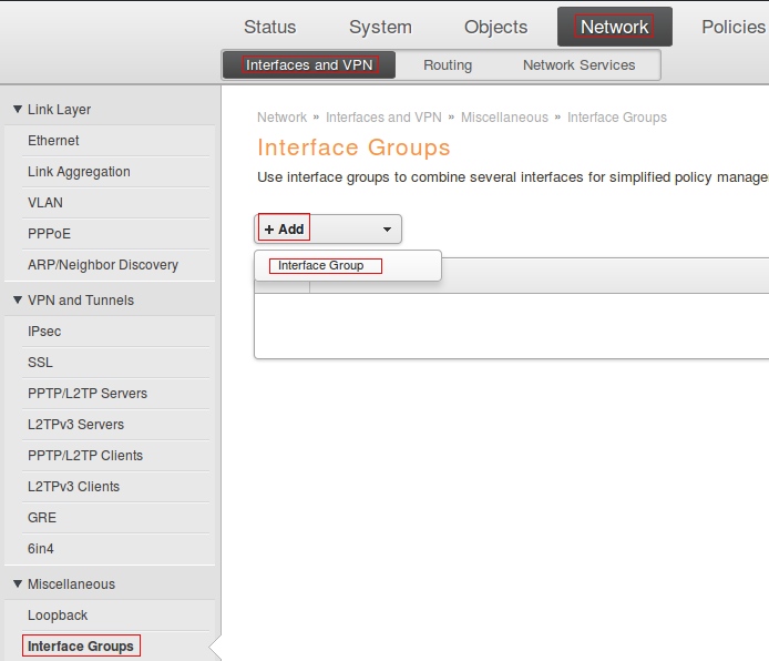 Пройдите в Web интерфейсе Network → Interfaces and VPN → Interface Group, затем нажмите кнопку Add и выберите Interface Group.