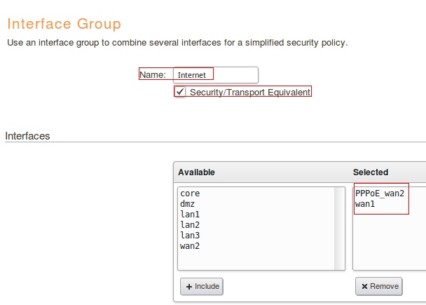 Назовите группу Internet, включите функцию Security/Transport Equivalent, выберите интерфейс wan1 и нажмите кнопку include, после чего повторите эти действия с интерфейсом PPPoE_wan2, после выполнения всех настроек нажмите Ок.
