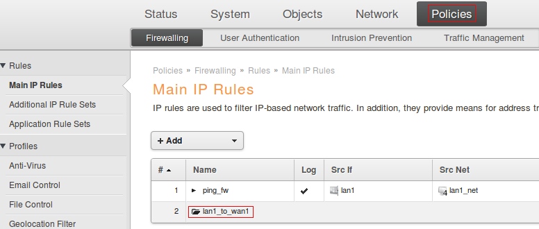 Пройдите в Web интерфейсе Policies → lan1_to_wan1