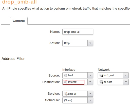 set IPRule 1(drop_smb-all) DestinationInterface=Internet
