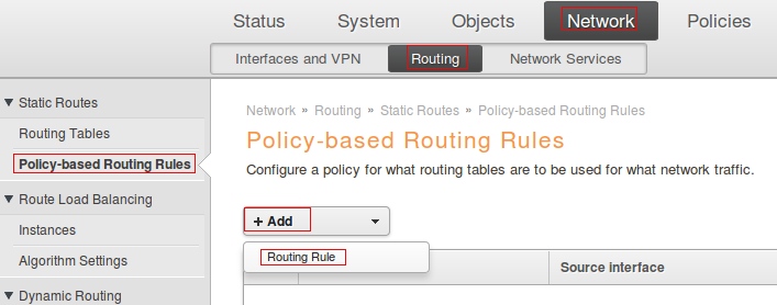 Пройдите в Web Network → Routin → Policy-based Routing rules, затем нажмите на кнопкку Add и выберите Routing Rules.