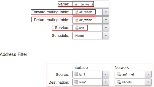 add RoutingRule SourceInterface=lan1 SourceNetwork=InterfaceAddresses/lan1_net DestinationInterface=wan1 DestinationNetwork=all-nets Service=ssh ForwardRoutingTable=alt_wan2 ReturnRoutingTable=alt_wan2 Name=ssh_to_wan2