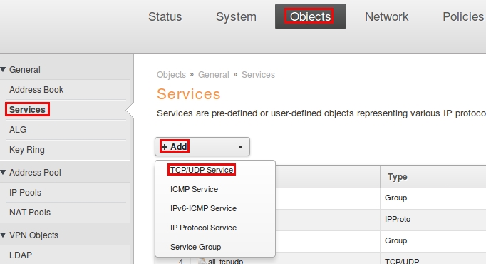 Пройдите в Web интерфейсе Objects → Services, нажмите кнопку Add и выберите TCP/UDP Service.
