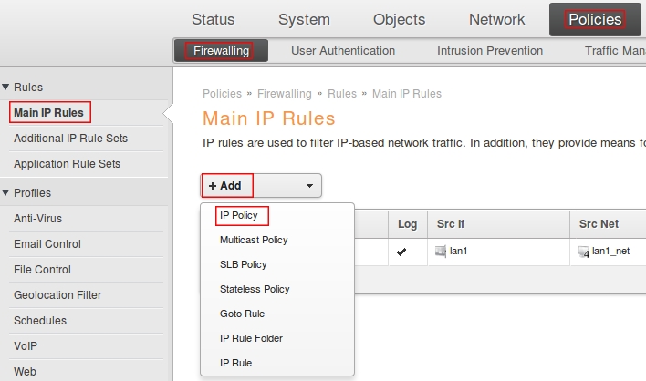 Пройдите в Web интерфейсе Policies → Firewalling → Main IP Rules нажмите на кнопку Add и выберите IP Policy.