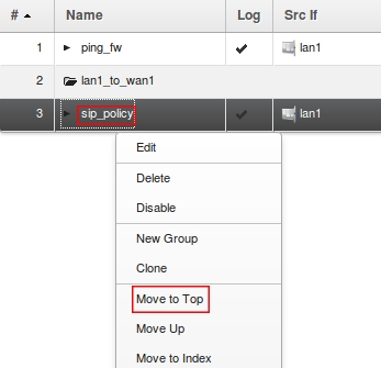 add IPPolicy Name=sip_policy Service=sip SourceInterface=lan1 SourceNetwork=InterfaceAddresses/lan1_net DestinationInterface=wan1 DestinationNetwork=all-nets Index=1 VoIP=Yes VoIP_Policy=sip SourceAddressTranslation=NAT